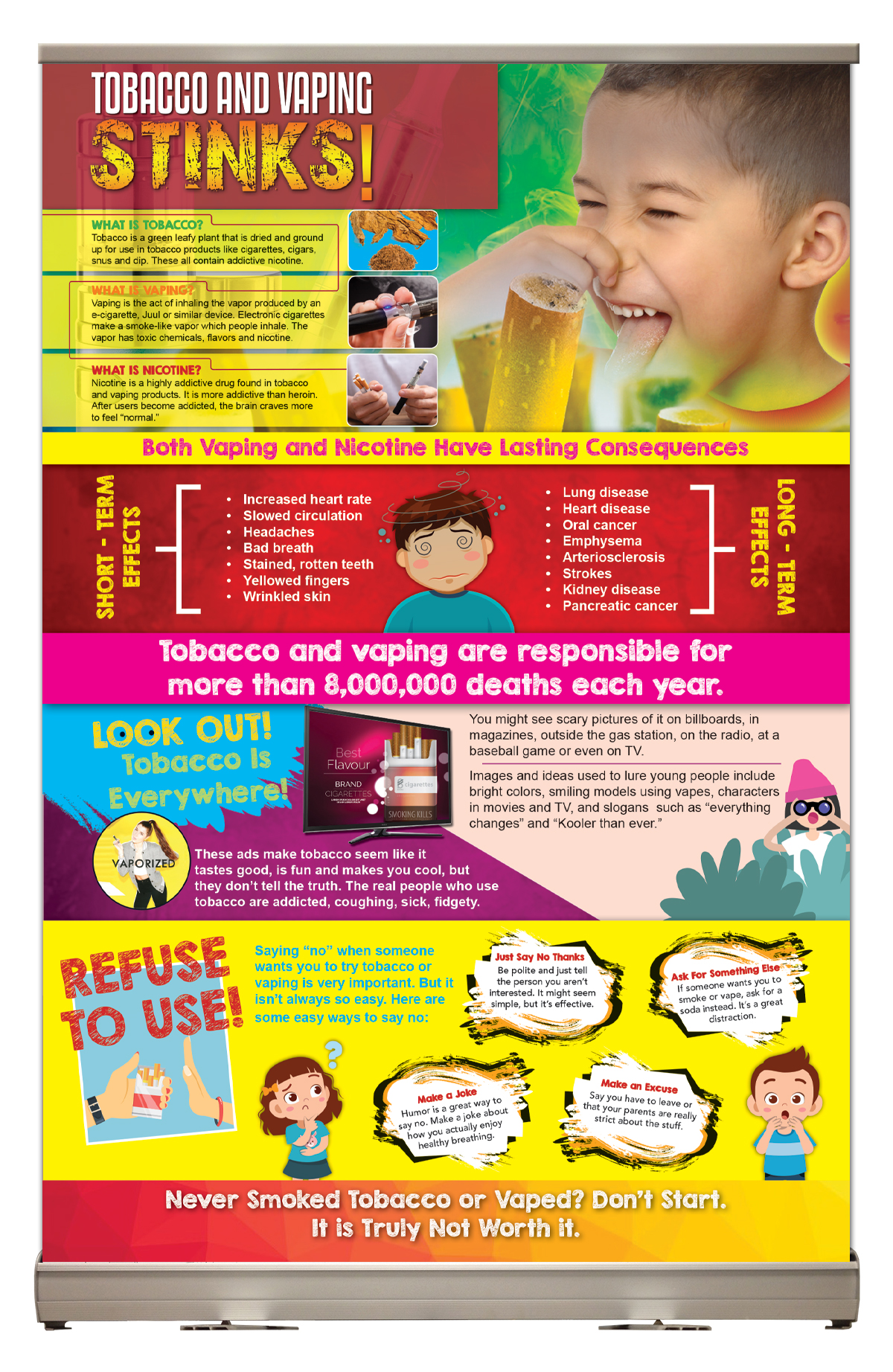 Protect kids from harmful habits with this vibrant “Tobacco and Vaping Stinks” Tabletop Display. Tobacco vaping and nicotine are harmful not just for adults, but for kids too. They are highly addictive substances that can damage the brain and body, especially when used at a young age. By using this roll up display to raise awareness about the harmful effects of tobacco vaping and nicotine, kids can learn about the dangers of these substances and why they should avoid them. They can also learn about the importance of respecting others’ health by not exposing them to the noxious smell of tobacco and vaping. Order now to create a safe and healthy environment for everyone!