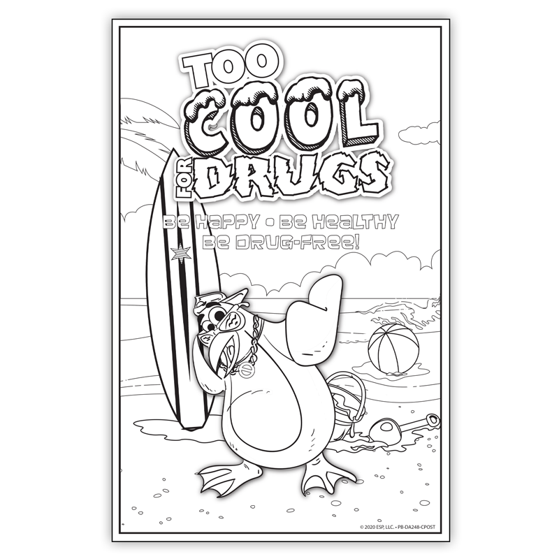 Remind children to be drug free with our fun and engaging “Too Cool for Drugs” Color Me Poster! A great activity while learning the importance about making smart choices and staying away from drugs. When the kids are finished coloring, hang them up in on the wall or fridge. Even in auditoriums, gymnasiums, cafeterias, classrooms and hallways and every time they see it, it’s another reminder that drugs are dangerous. Every kid loves penguins and who better to listen to than this cool guy hanging out on a beach! A great learning activity to help prevent drug abuse. A great addition for Red Ribbon Week!