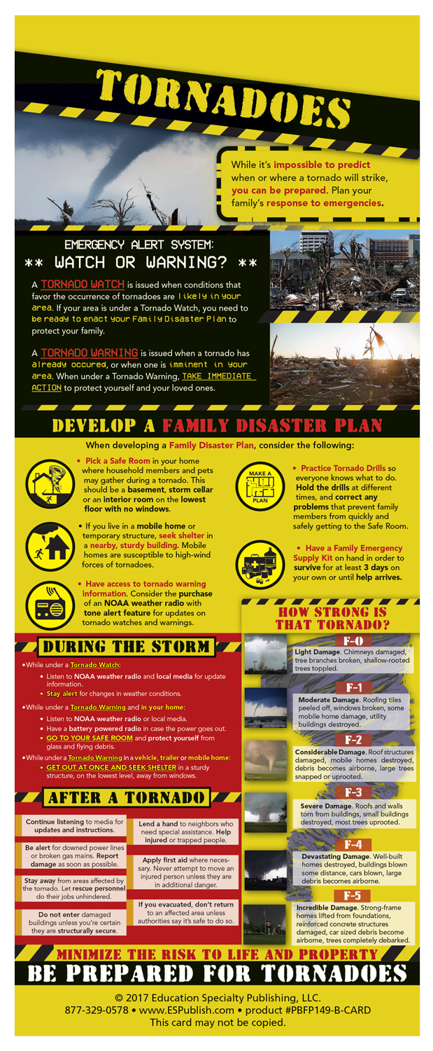 - Increased Awareness: Each card is a smaller, pocket sized version of our matching “Tornadoes” Displays. A great reminder to leave behind, reinforcing the information described in the display. They’re also great as a stand alone product that provides bulleted, easy to understand information.