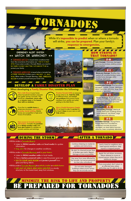 Help your community develop a disaster safety plan with our eye catching Tornadoes Tabletop Display. It focuses on the necessary planning and preparedness steps that families and individuals can take to be disaster ready. In a tornado emergency, a few seconds can mean the difference between life and death. The banner explains the difference between a Tornado Watch and a Tornado Warning. It addresses how to create an escape plan, steps to disaster readiness, tornado drills as well as what to do during and after the storm.