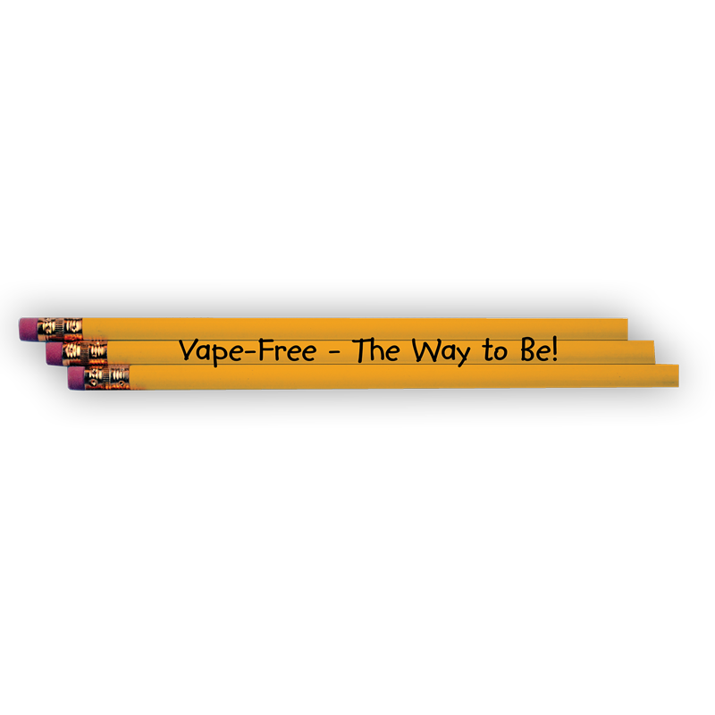 Stress the importance to stop vaping with our “Vape Free – The Way to Be” Pencils! Perfect to hand out during the Great American Smokeout, Kick Butt’s Day and more. Your audience will love these yellow pencils that encourage a healthy, vape-free lifestyle. A great promotional giveaway for all types of events, and this affordable pencil is always a hit! The front of the standard #2 pencil displays our special anti-vape message with a soft eraser on the other end.
