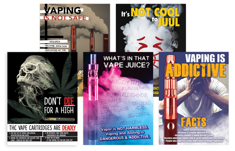 Spread the word about the dangers of vaping and e-cigarettes with our Vaping Prevention Poster Package. Vape related lung damage and vaping sicknesses are on the rise in teens. Educate our youth that vaping is addictive and dangerous. Posters are extremely useful decorations for high traffic areas so that you get your message out there. So make an impact in your community today! Great for auditoriums, gymnasiums, cafeterias, community centers, hallways, and even the exterior of your school. What’s more, customers love buying our posters for their students to sign during awareness events or other prevention programs.