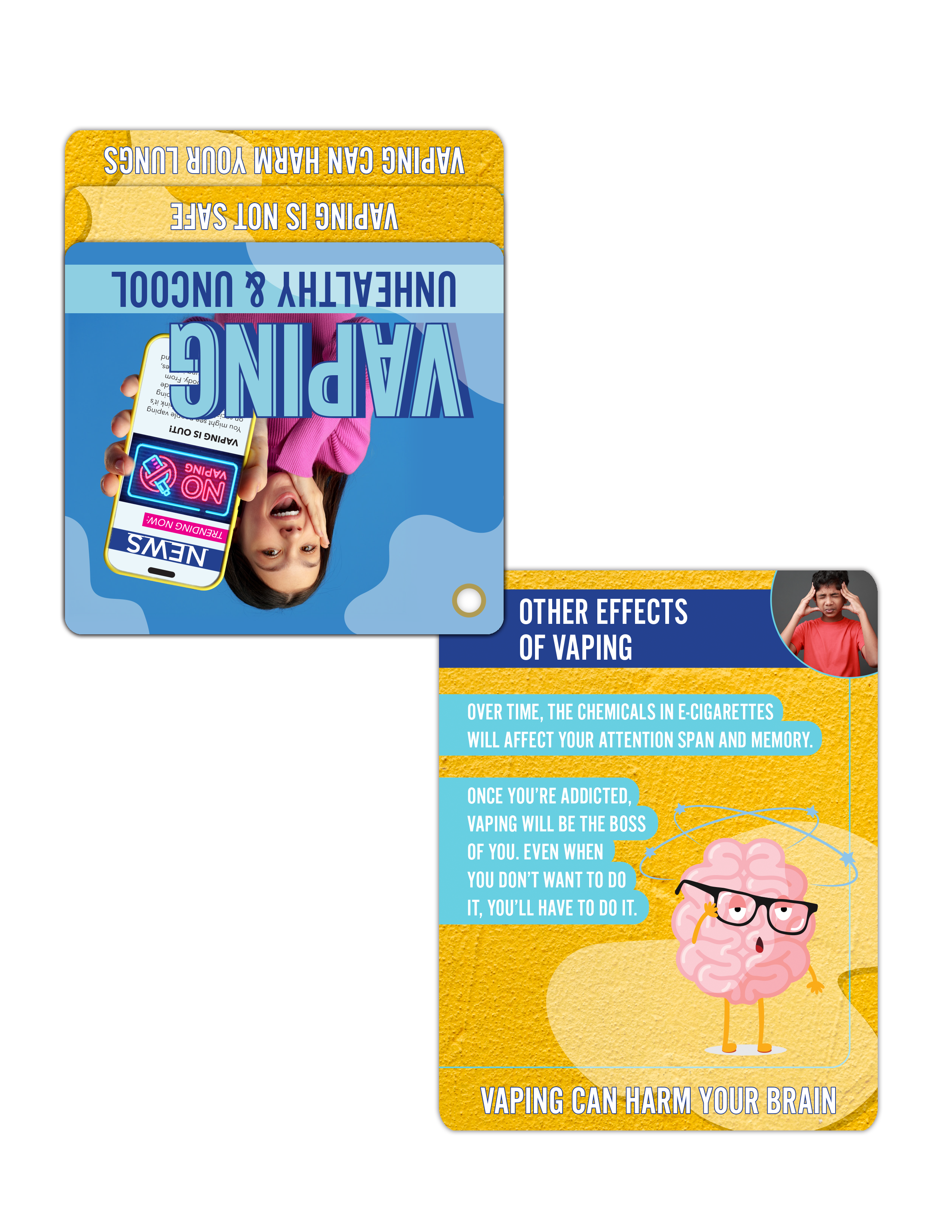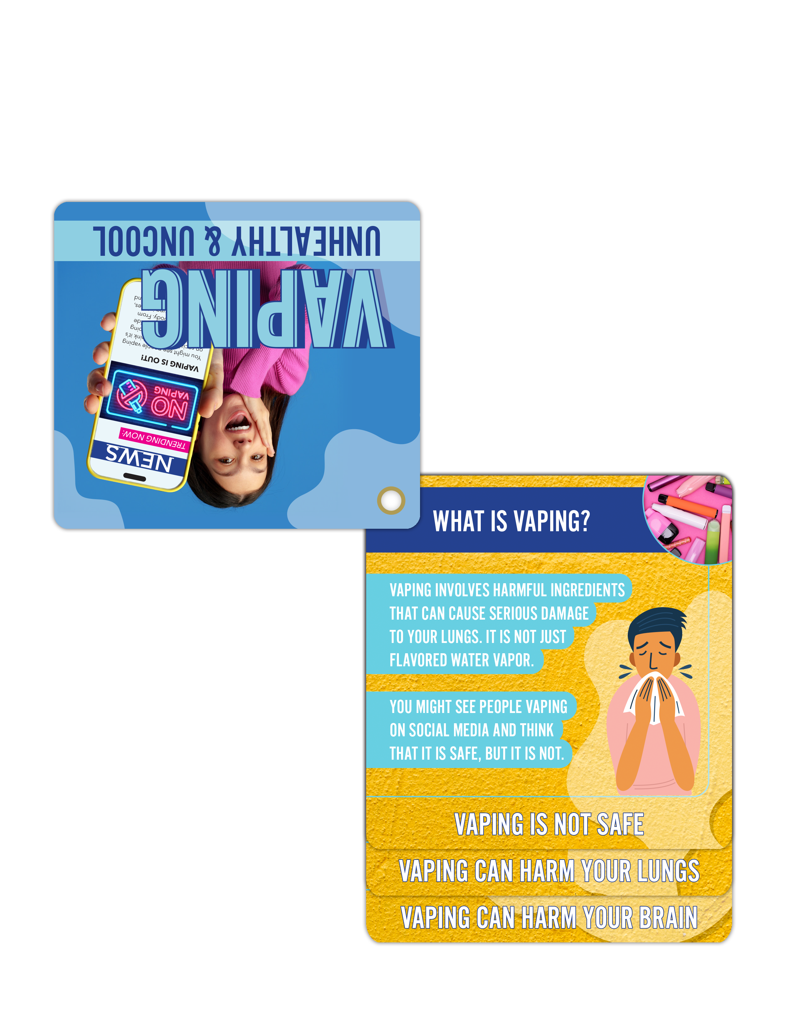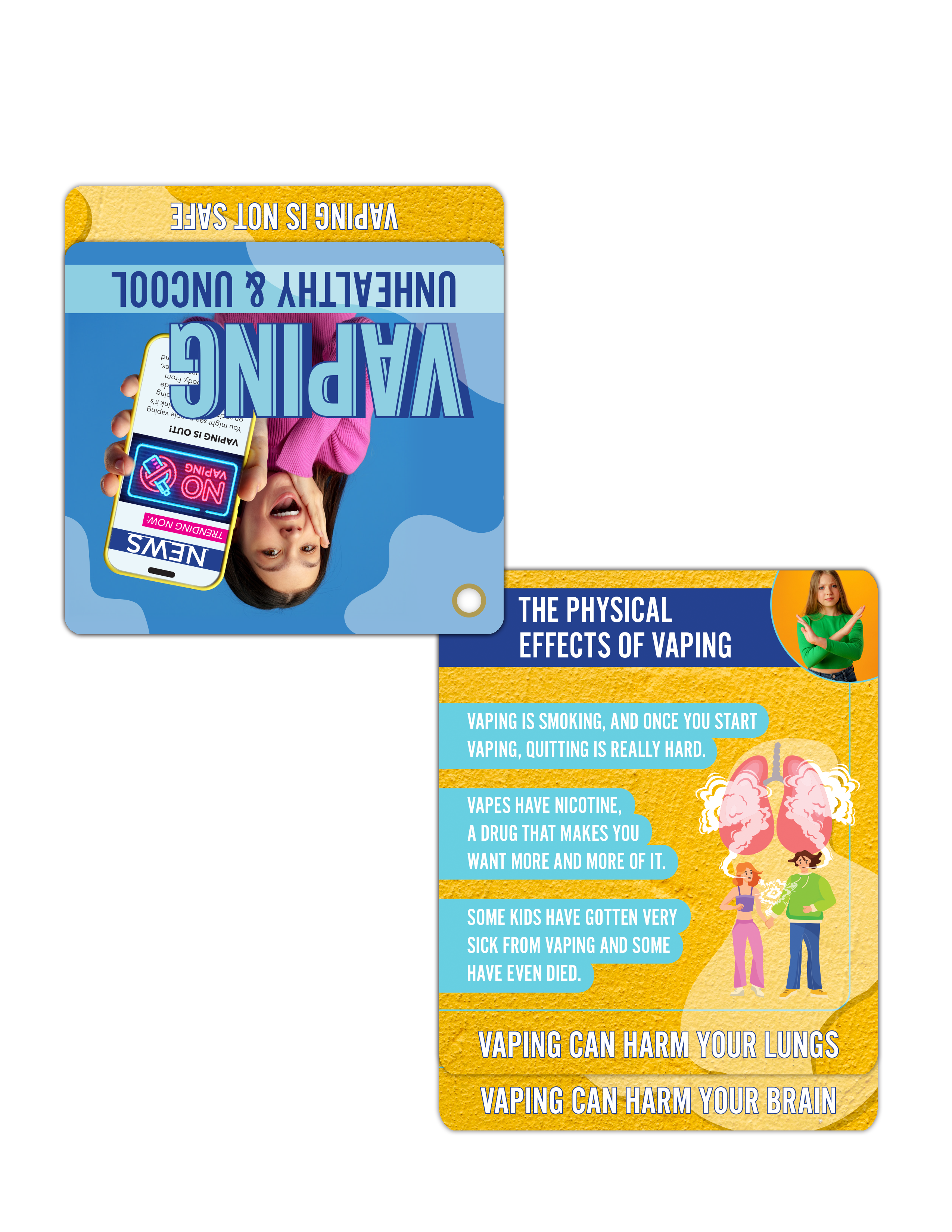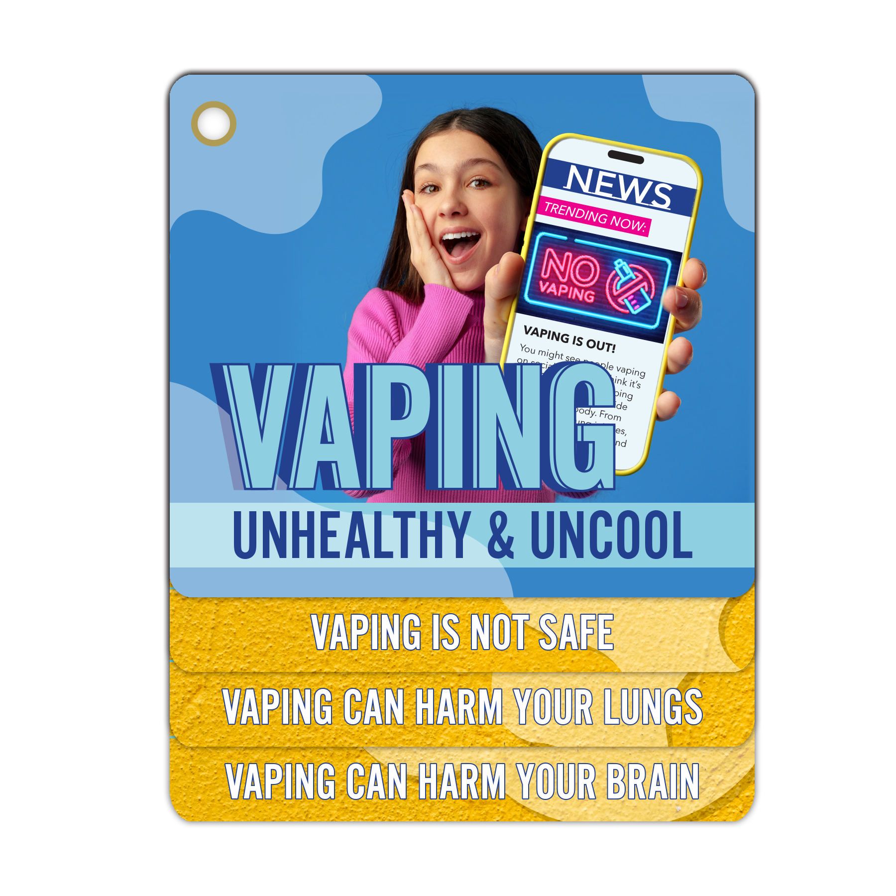 Hand them out at at vaping prevention events, school assemblies, or during community outreach programs. Every flip becomes a driving force in advocating for informed choices, protecting kids, and keeping vaping out of the cool zone.