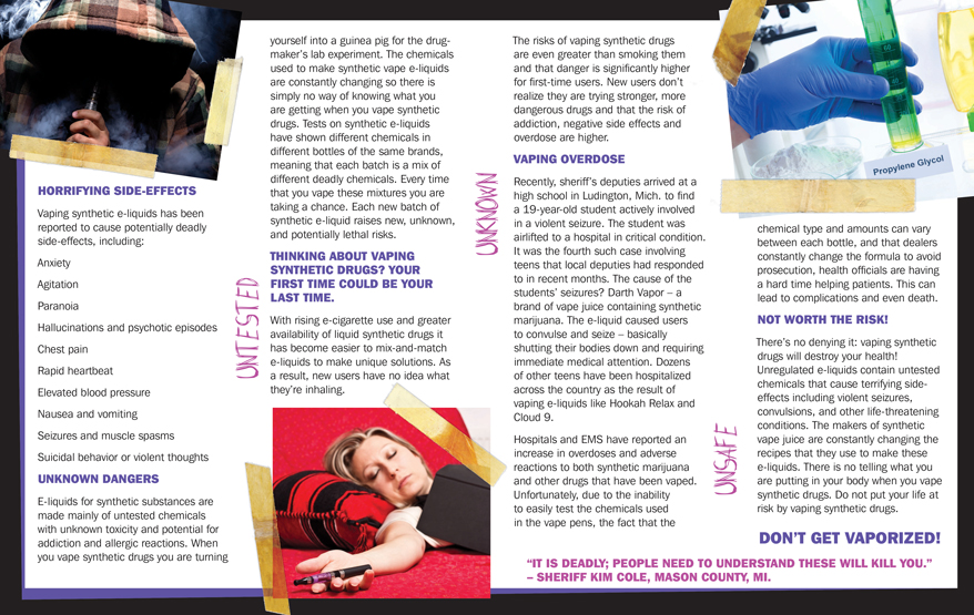 The brochure focuses on the dangers and side effects of vaping synthetic drugs. Including both synthetic marijuana and bath salts. It explores the horrifying side effects and unknown dangers of inhaling untested and unregulated chemicals. Plus the risk of overdose associated with these chemicals. Vaping synthetic drugs is not worth the risk of violent seizures, convulsions, respiratory issues and also death.