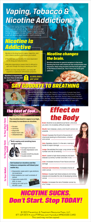 Spread the word about the dangers of “Vaping, Tobacco and Nicotine Addiction” with this educational information card. This card is a great educational tool for all ages to be reminded of just how vaping, tobacco and nicotine can impact their health. From changes in the brain to breathing and lung damage. Listing the cost of vaping, tobacco, and nicotine to your short and long term health, as well as to your wallet. These handouts provide quick, easy to read facts to help your community understand the dangers involved in vaping, tobacco and nicotine use.
