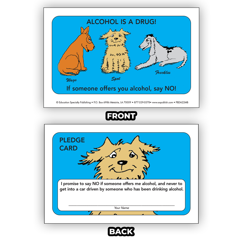 The Misadventures of Wags & Freckles Membership Card has a bright design and a memorable message: “Say No! to Alcohol.” Perfect handout after watching PreventionPower’s Misadventures of Wags & Freckles. This program is best for ages Pre-K to 1st grade.
