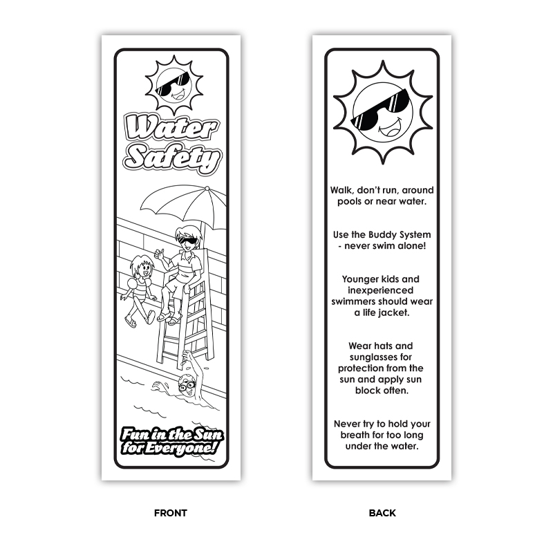 The front features our fun, themed “Water Safety” illustration that gives them a full coloring area that lets their imagination soar. On the back of the bookmarks includes a continuation of the artwork found on the front as well as useful tips.