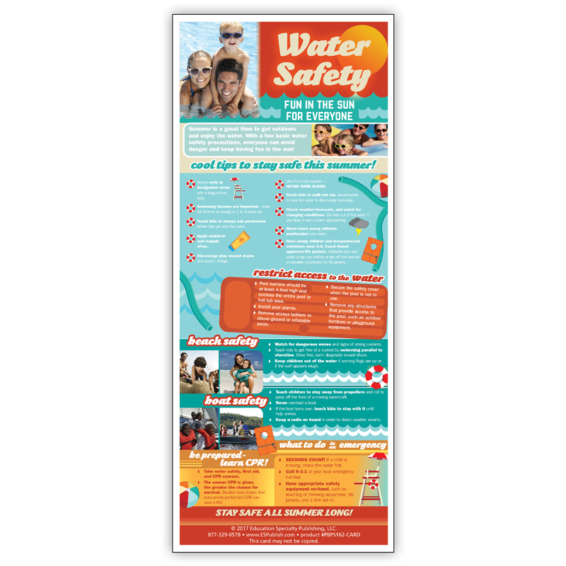 Our “Water Safety – Fun in the Sun for Everyone” Information Card is a great resource to educate parents and caregivers about the importance of water safety. Each card includes information on pool, swimming, beach and boating safety. Drowning is the second leading cause of death for young children.