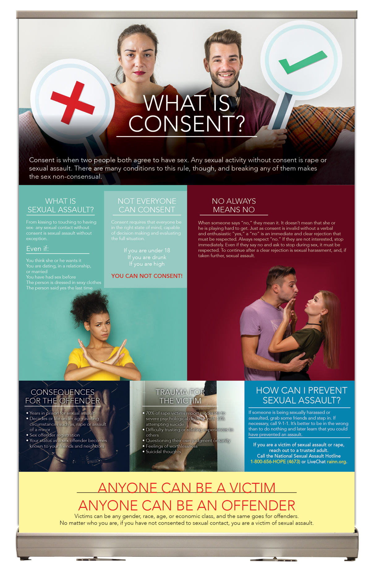 The “What is Consent” retractable tabletop banner provides parents and young adults with the information concerning consent, sexual assault, and rape. This engaging retractable banner describes the basic definition of what consent is. Highlighting that No always means No.