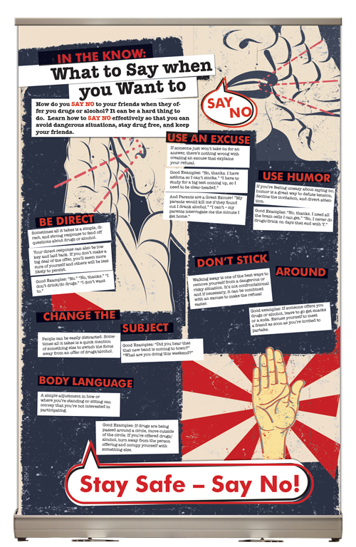 Straightforward and engaging, this retractable tabletop banner details various techniques and methods that young people can use when they want to say “no” to drugs or alcohol. These different approaches enable teens to say “no” while keeping their friends and avoiding risky situations.