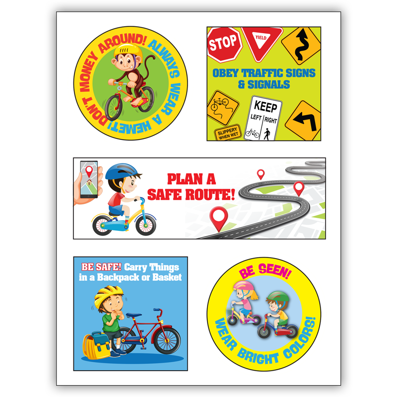 Each sheet includes five stickers that focus on importance of wearing helmets, obeying traffic signs and signals, planning a safe route and more. Every sticker sheet includes five bold, colorful bicycle safety messages that exude positivity, such as “be seen! Wear bright colors” and “plan a safe route”. Kids can put them on their folders, water bottles, laptop cases, etc. And even better, it’s affordable so you can give your audience a memorable gift without breaking the bank. A great handout at any community safety awareness event or schools.