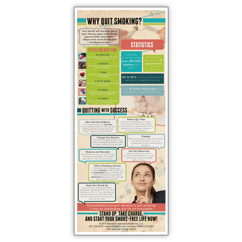 This Why Quit Smoking information card is a great addition to any cessation program. It acts as a nice introduction for smokers who are ready to begin the quitting process. The handout opens by providing a broad overview of why smokers should quit. Like, improved health, more money, increased social opportunities, and the elimination of secondhand and thirdhand smoke.