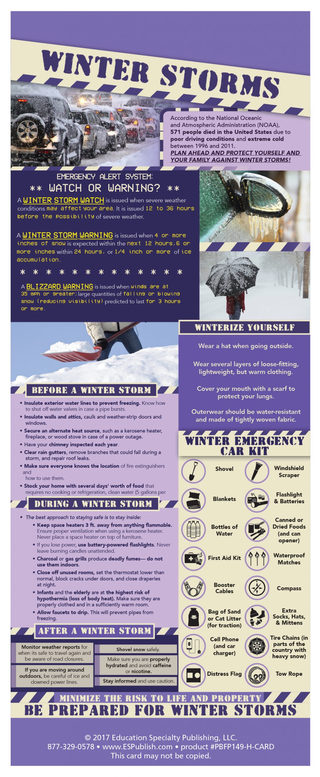 - Increased Awareness: Each card is a smaller, pocket sized version of our matching “Winter Storms” Displays. A great reminder to leave behind, reinforcing the information described in the display. They’re also great as a stand alone product that provides bulleted, easy to understand information.