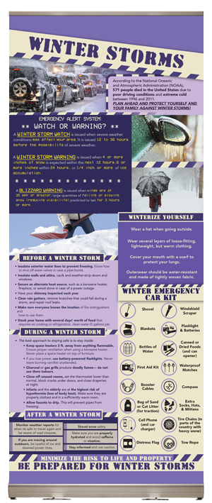 The display includes an overview of how to prepare yourself and your property for the event of a winter storm. Recommending how common household fixes that may help protect against the effects of severe winter weather. The banner also advises viewers about different ways to stay safe during the storm as well as recommending added caution even after the storm has passed. Also included are tips for protective winter dress and preparing an Emergency Car Kit.