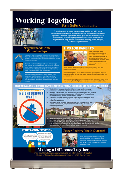 This display is a comprehensive guide, covering everything from establishing neighborhood watches to fostering communication among community members and their local law enforcement. With visually appealing graphics and user-friendly content, this retractable display is specifically designed for ease of understanding. It serves as a focal point for discussions, encouraging neighbors to work together towards a common goal of safety. From home security tips to building a successful neighborhood watch, it empowers individuals with practical knowledge.