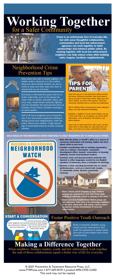 Each card is a comprehensive guide, covering everything from establishing neighborhood watches to fostering communication among community members. It’s perfect for educators looking to engage their community during crime prevention awareness events, providing essential tips and strategies to create a secure living environment. It serves as a focal point for discussions, encouraging neighbors to work together towards a common goal of safety. From home security tips to emergency preparedness, it provides individuals with practical knowledge.