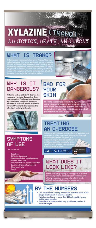 Raise awareness about the serious risks of Xylazine (Tranq) with our engaging retractable Presentation Display. This visually captivating display sheds light on the serious dangers of xylazine abuse, from addiction to the devastating consequences of death and decay. With clear visuals and concise information, it’s an effective way to capture attention and deliver crucial messages.