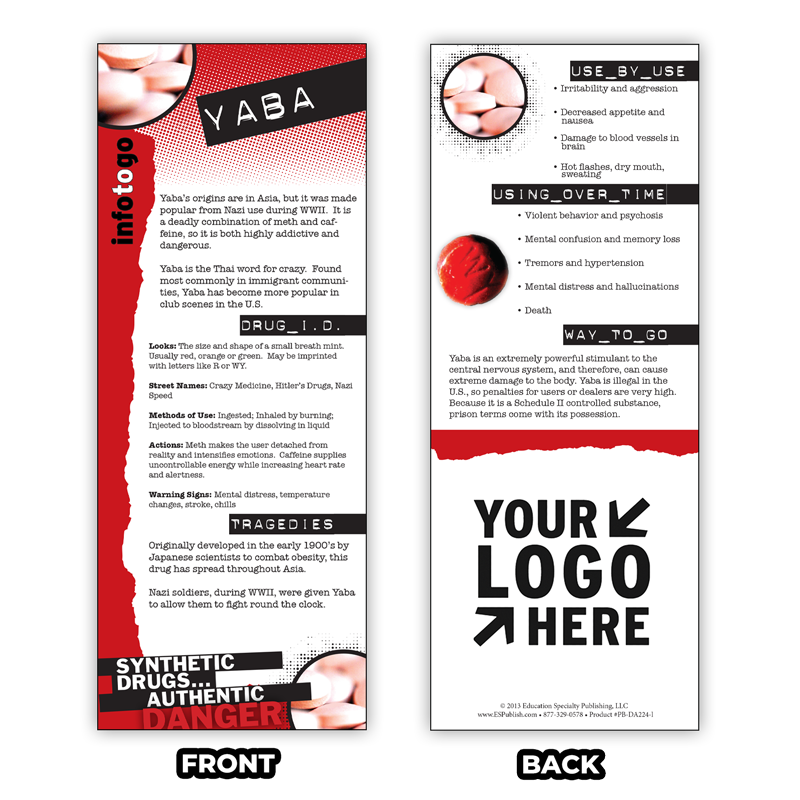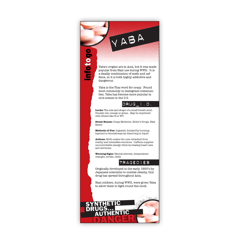 With this rack card, your audience will come to understand just how dangerous Yaba can be. It begins by explaining that while the drug originated in Asia, this mixture of methamphetamine and caffeine became popular during World War II when Nazis used it to boost their energy and alertness while on the frontlines. The drug remains popular in Asia and has begun to appear on the club scene in the United States.